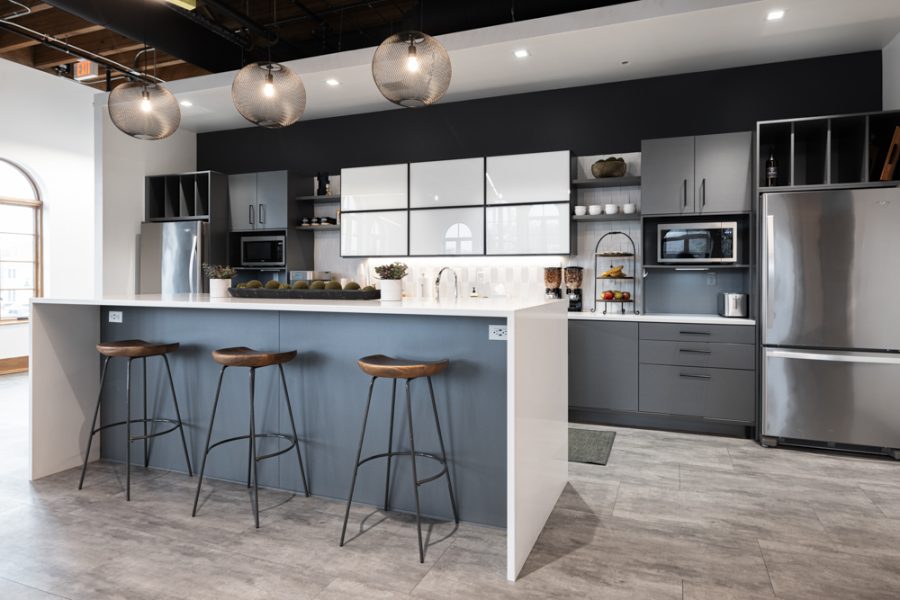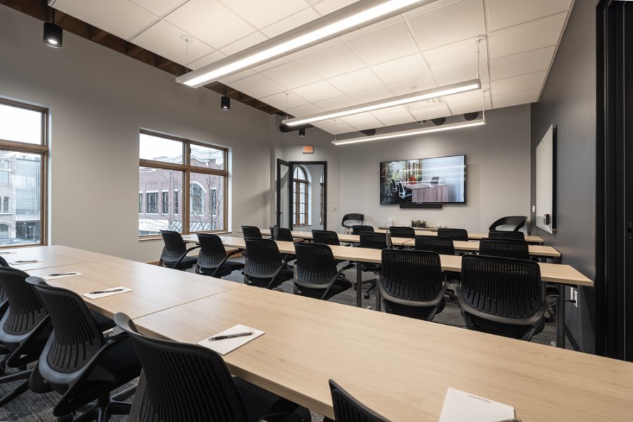 - Light fixtures over the kitchen island and in the large conference room, balancing style with functionality